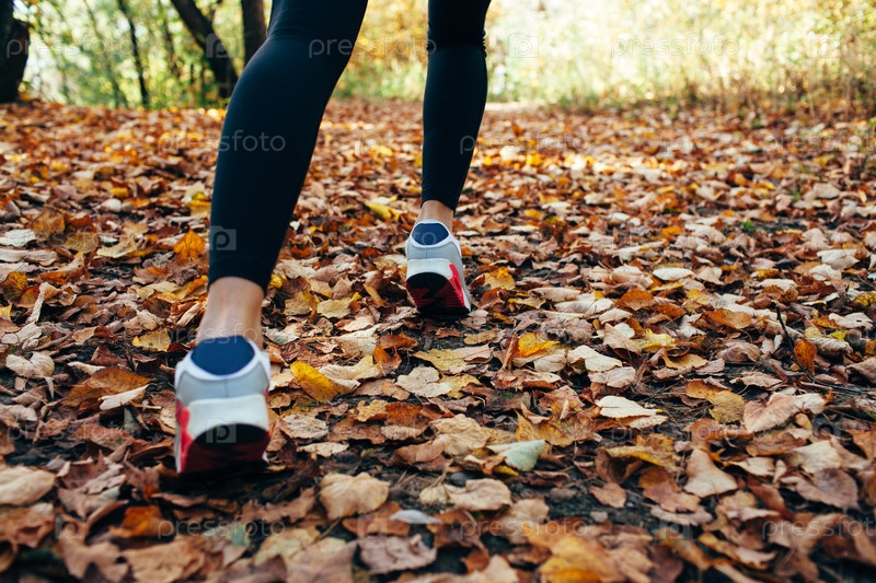 Женщина проходит за осенней листвой, обувь крупным планом