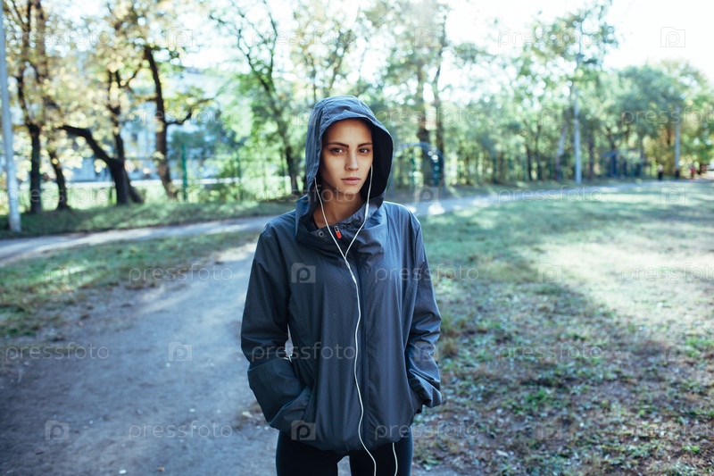 Спортивный женщина носить капюшон куртки и прослушивания музыки