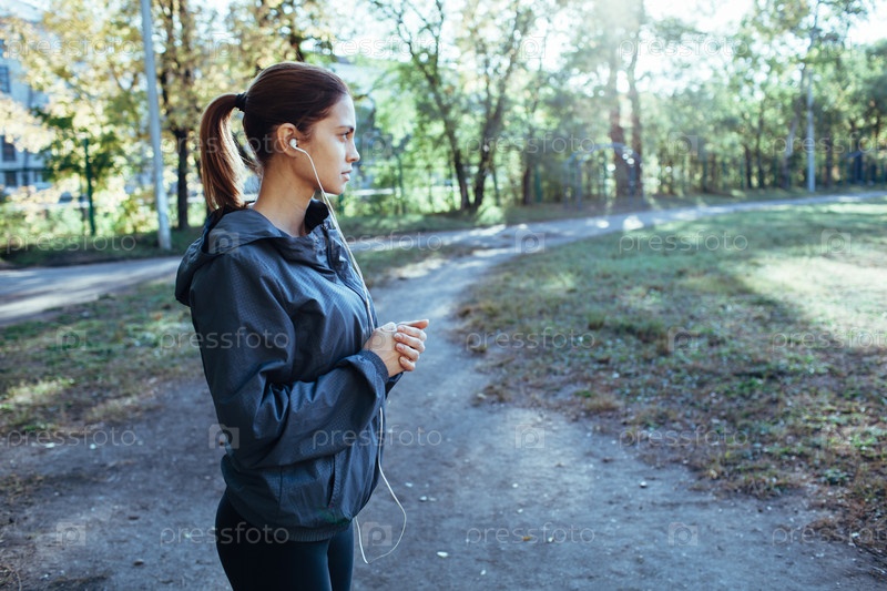 Спортивный женщина носить капюшон куртки и прослушивания музыки