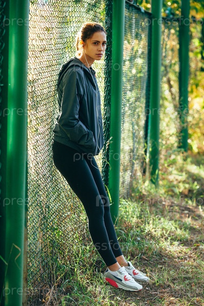 Спортивный женщина носить капюшон куртки и прослушивания музыки
