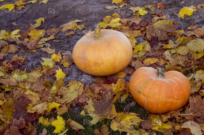 Осенние тыквы, окруженный кленовых листьев на огромный камень
