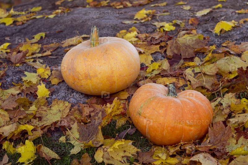 Осенние тыквы, окруженный кленовых листьев на огромный камень