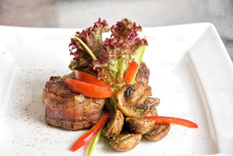 Вкусный стейк из говядины, украшенный овощами и жареными грибами