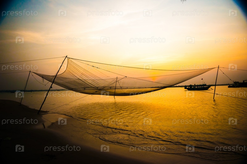 Рыболовная сеть на просушке на закате