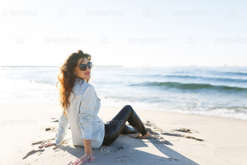 Женщина, сидя на пляже