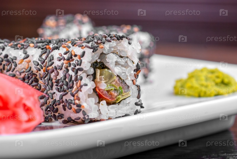 Суши с авокадо, лососем и огурцом