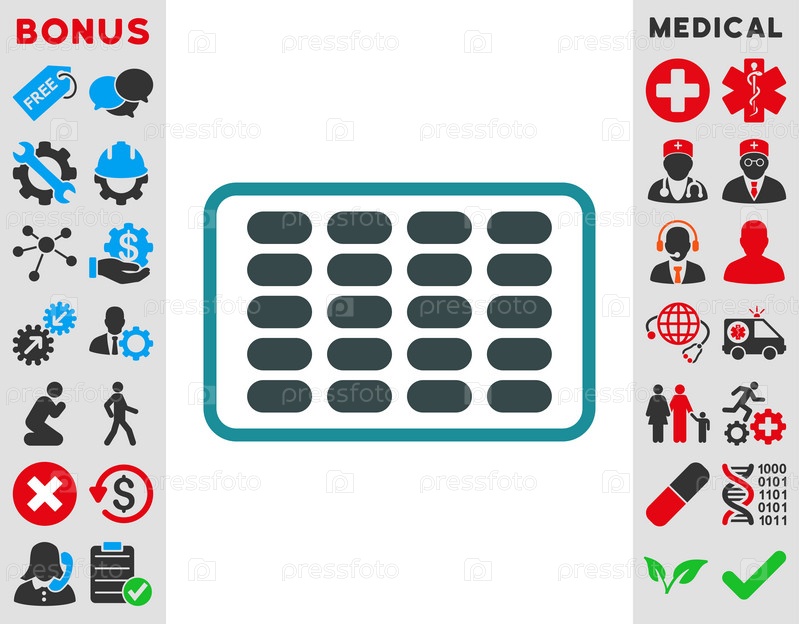 Блистер иллюстрации значок. Стиль-биколор плоский символ, мягкого синего цвета, закругленные углы, белый фон