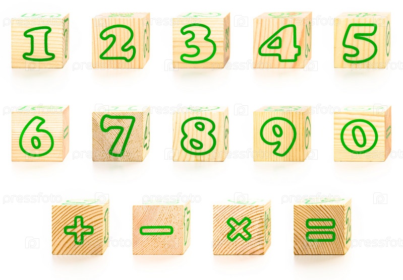 Деревянные кубики с цифрами и знаками на белом фоне