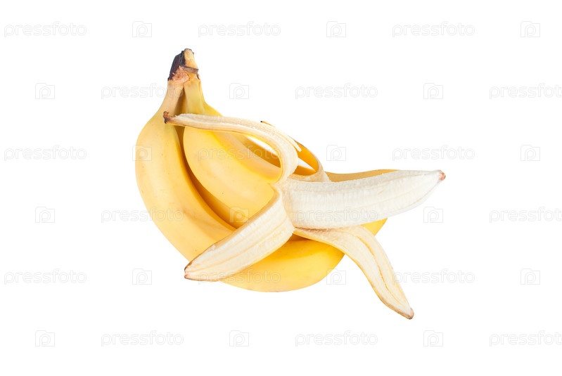 Связка спелых бананов на белом фоне, один полу очищенный