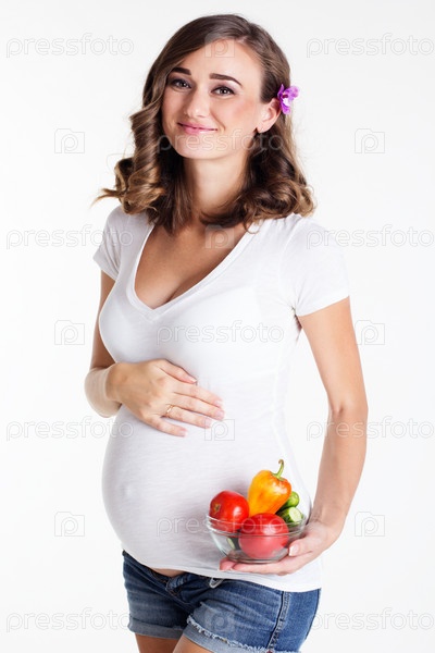 Беременная женщина с тарелкой свежих овощей