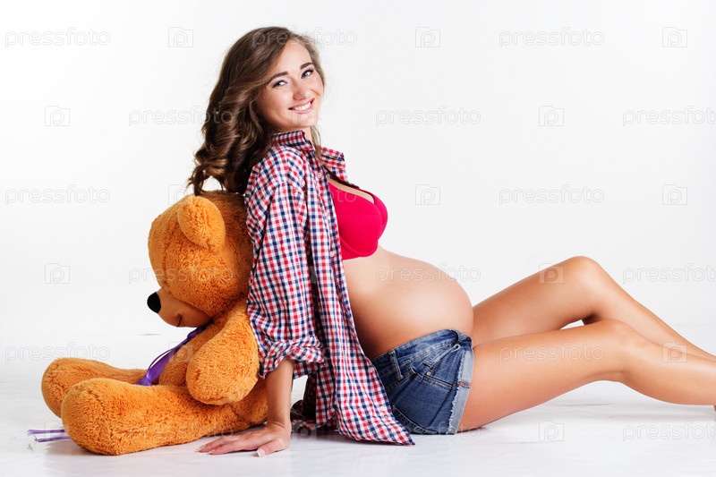 Молодая беременная женщина с мишкой