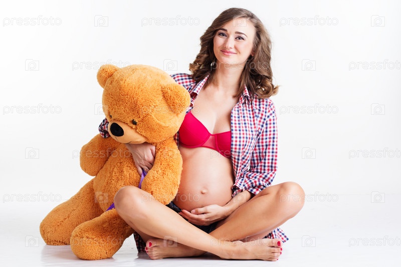 Молодая беременная девушка с плюшевым медведем