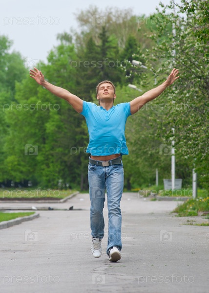 Красивый мускулистый парень на пробежке в парке с поднятыми руками