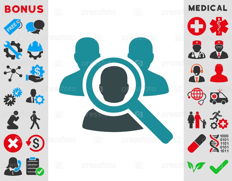 Значок поиска пациента иллюстрации. Стиль-биколор плоский символ, мягкого синего цвета, закругленные углы, белый фон