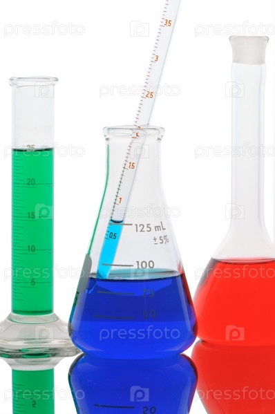 Емкости с разноцветной жидкостью на белом