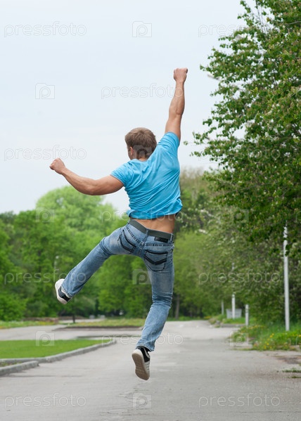 Счастливый молодой человек прыгает вверх с поднятыми руками в парке
