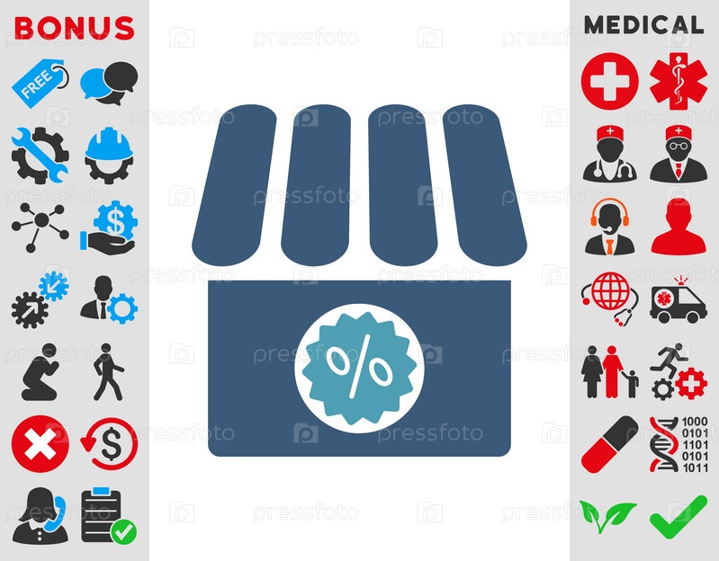 Аптека продажа иллюстрации значок. Стиль является биколор плоский символ, голубой и синий цвета, закругленные углы, белый фон