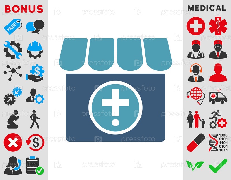 Аптека иллюстрации значок. Стиль является биколор плоский символ, голубой и синий цвета, закругленные углы, белый фон