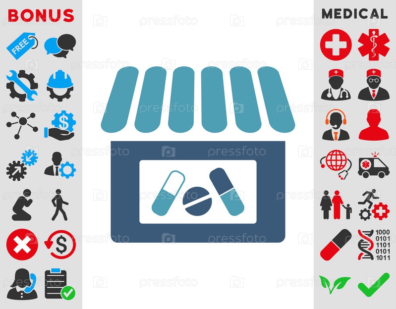 Аптека иллюстрации значок. Стиль является биколор плоский символ, голубой и синий цвета, закругленные углы, белый фон