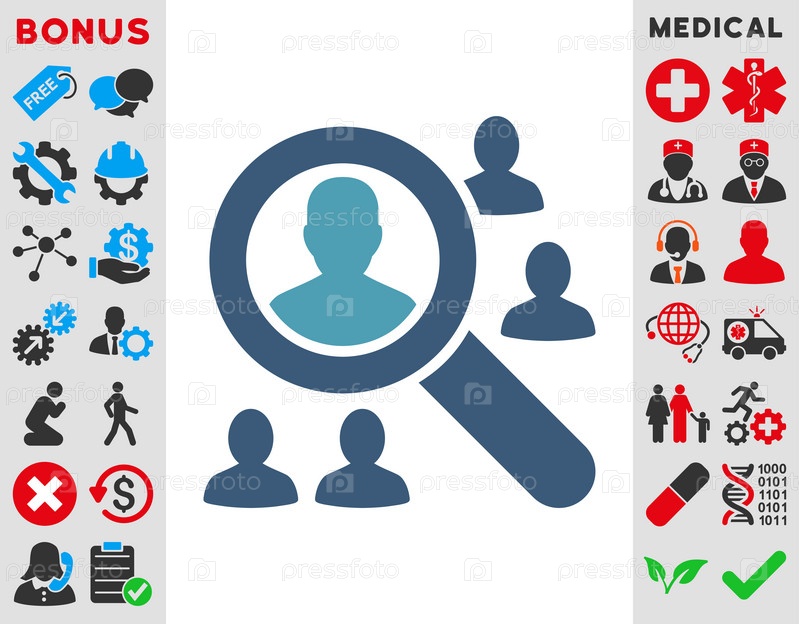 Исследуйте пациентов иллюстрации значок. Стиль является биколор плоский символ, голубой и синий цвета, закругленные углы, белый фон