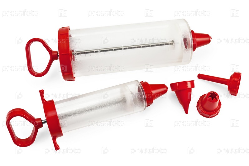 Два кондитерских шприца разного размера со сменными насадками на белом фоне