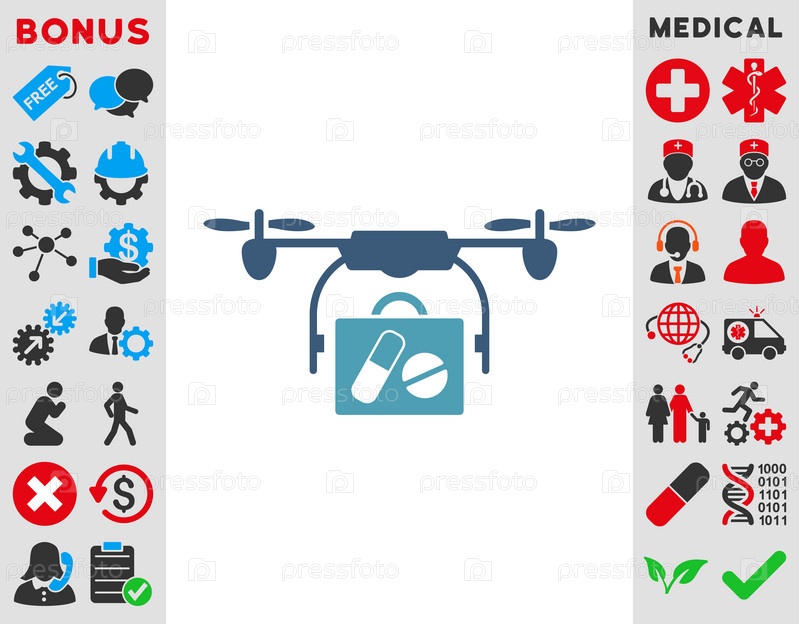 Медицинской иллюстрации значок дрон отправления. Стиль является биколор плоский символ, голубой и синий цвета, закругленные углы, белый фон