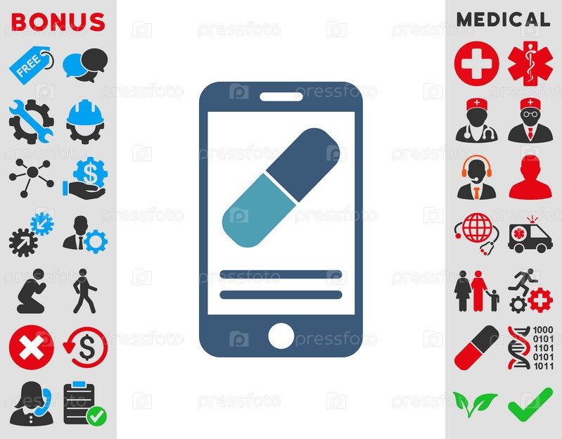 Лекарства онлайн информации иллюстрации значок. Стиль является биколор плоский символ, голубой и синий цвета, закругленные углы, белый фон