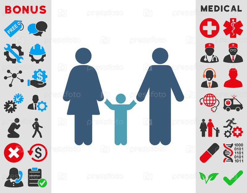 Родители и ребенок иллюстрации значок. Стиль является биколор плоский символ, голубой и синий цвета, закругленные углы, белый фон