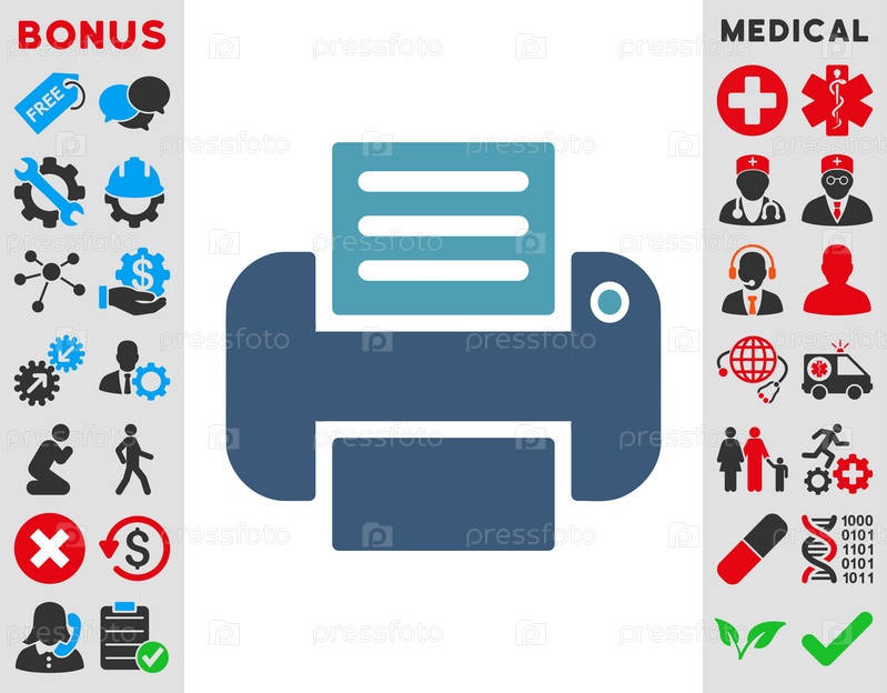 Значок печати иллюстрации. Стиль является биколор плоский символ, голубой и синий цвета, закругленные углы, белый фон