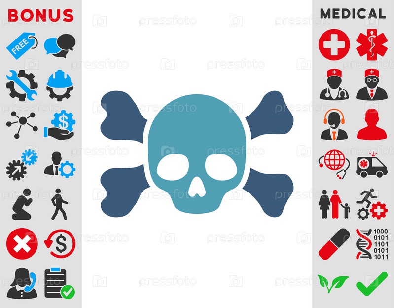 Череп и кости иллюстрации значок. Стиль является биколор плоский символ, голубой и синий цвета, закругленные углы, белый фон