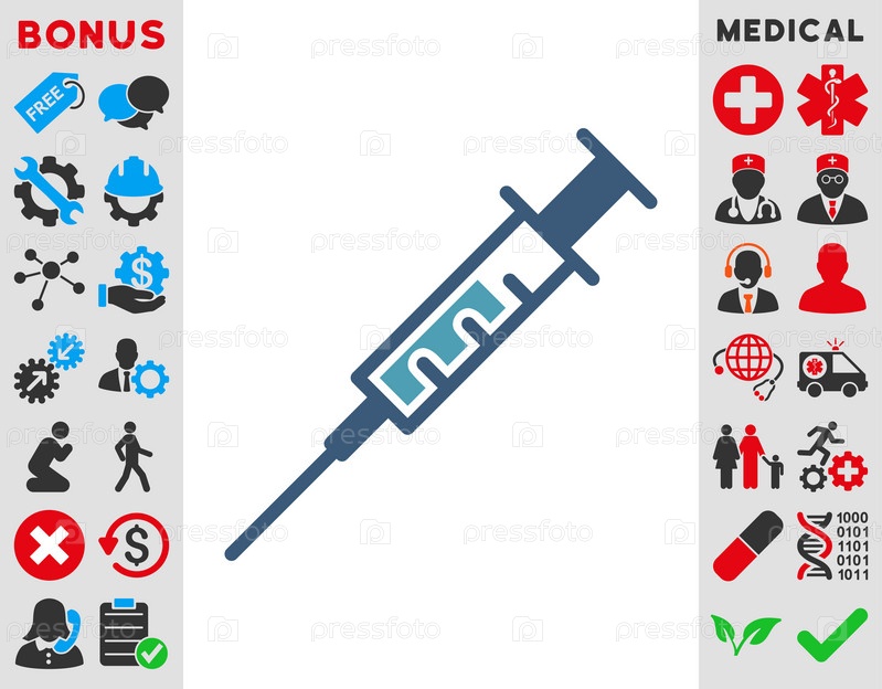 Шприц иллюстрации значок. Стиль является биколор плоский символ, голубой и синий цвета, закругленные углы, белый фон