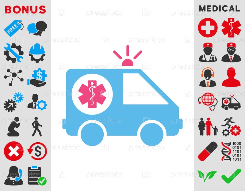 Иконка иллюстрации автомобиль скорой помощи. Стиль является биколор плоский символ, розовый и голубой цвета, закругленные углы, белый фон