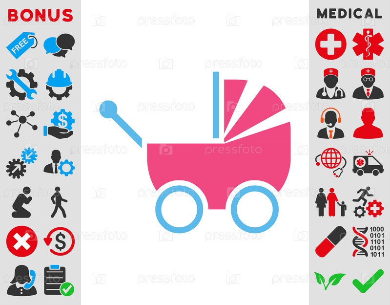 Детские коляски иллюстрации значок. Стиль является биколор плоский символ, розовый и голубой цвета, закругленные углы, белый фон