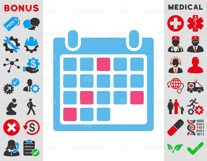 Иконка Календарь назначения иллюстрации. Стиль является биколор плоский символ, розовый и голубой цвета, закругленные углы, белый фон