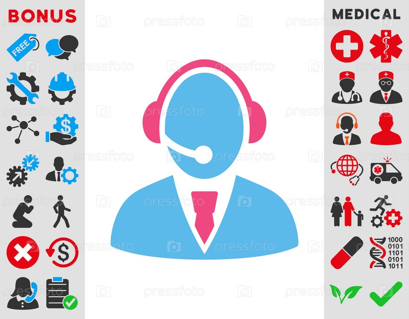 Центр звонков работник иллюстрации значок. Стиль является биколор плоский символ, розовый и голубой цвета, закругленные углы, белый фон
