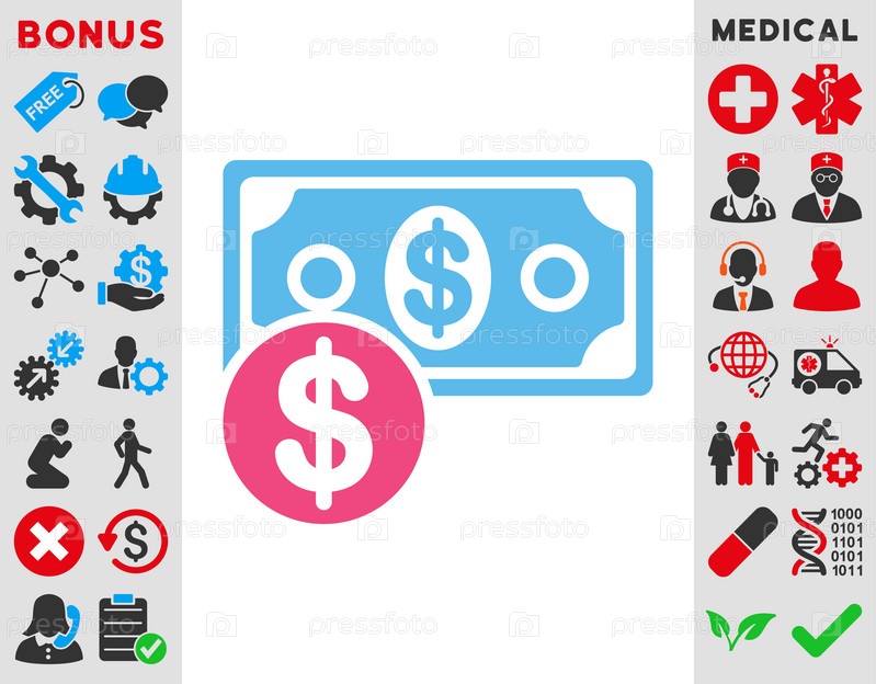 Наличные деньги иллюстрации значок. Стиль является биколор плоский символ, розовый и голубой цвета, закругленные углы, белый фон