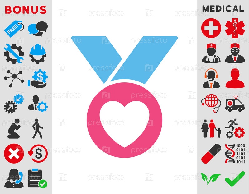 Икона иллюстрации медаль благотворительность. Стиль является биколор плоский символ, розовый и голубой цвета, закругленные углы, белый фон