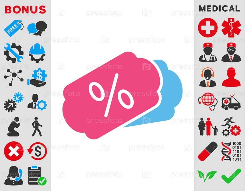 Скидка купоны иллюстрации значок. Стиль является биколор плоский символ, розовый и голубой цвета, закругленные углы, белый фон
