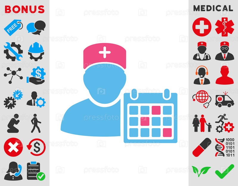 Доктор назначения иллюстрации значок. Стиль является биколор плоский символ, розовый и голубой цвета, закругленные углы, белый фон