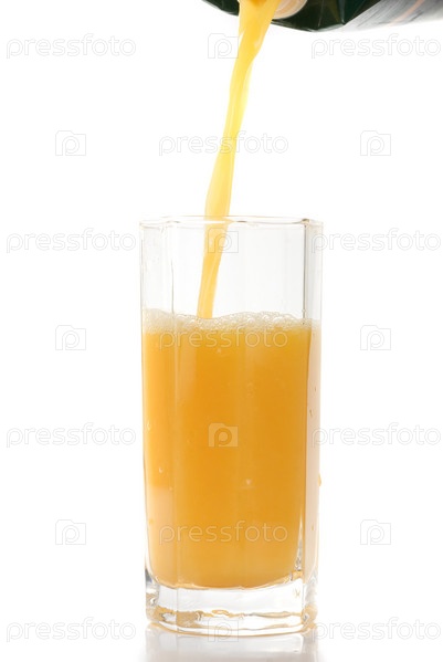 Апельсиновый сок наливают в стакан на белом фоне