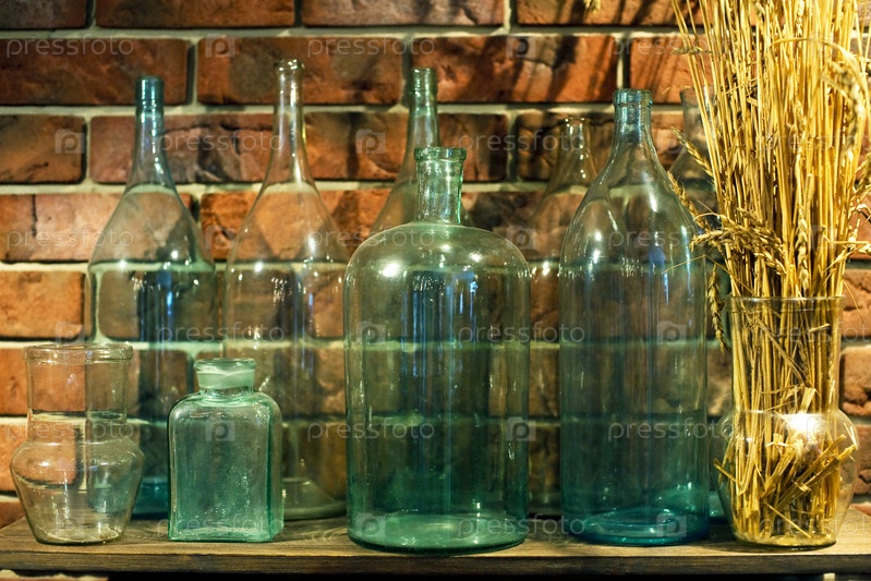 Пустые бутылки и колосья пшеницы расположены на фоне кирпичной стены