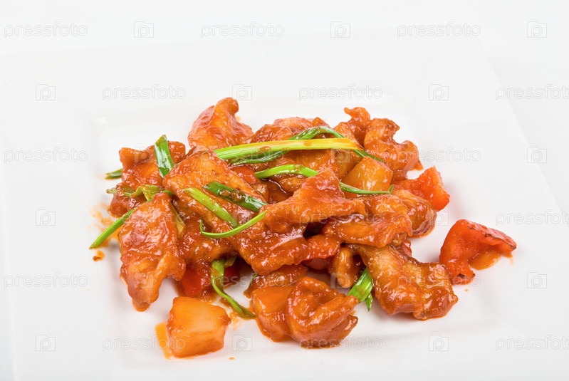 Жареная говядина в кисло-сладком соусе на белом фоне