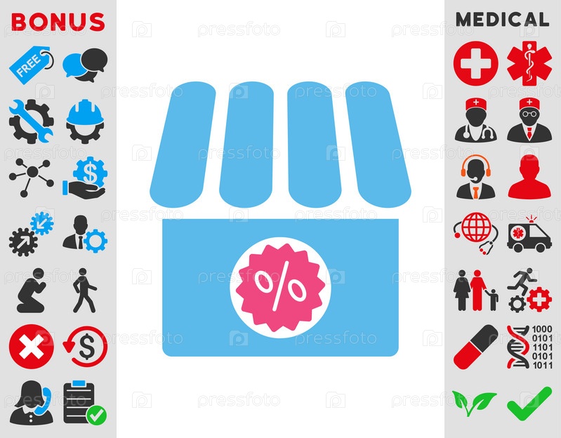 Аптека продажа иллюстрации значок. Стиль является биколор плоский символ, розовый и голубой цвета, закругленные углы, белый фон