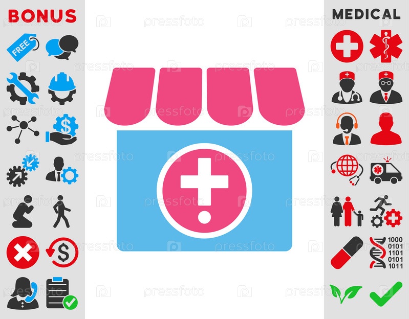 Аптека иллюстрации значок. Стиль является биколор плоский символ, розовый и голубой цвета, закругленные углы, белый фон