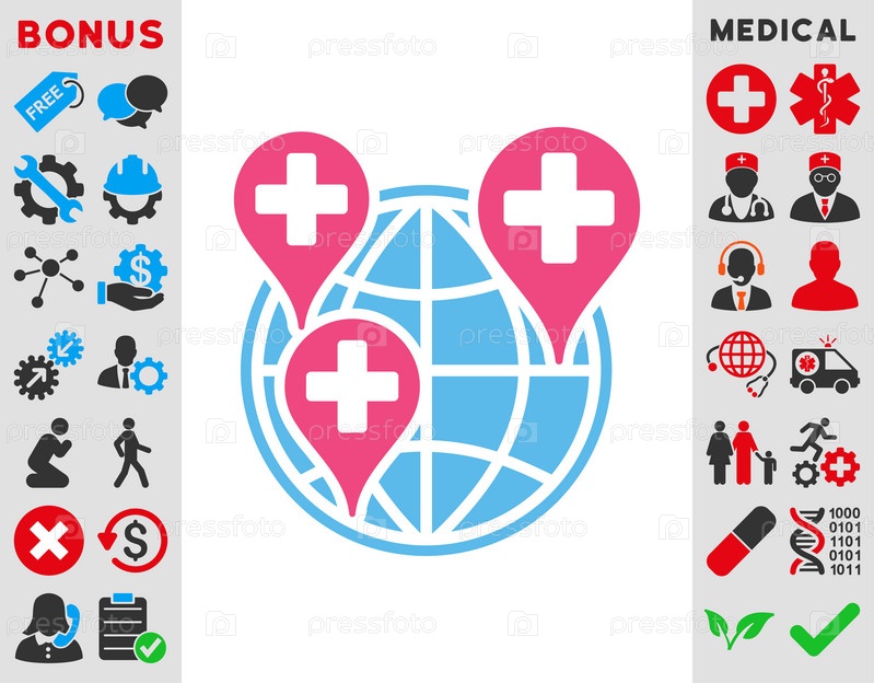 Глобальные компании клиника иллюстрации значок. Стиль является биколор плоский символ, розовый и голубой цвета, закругленные углы, белый фон