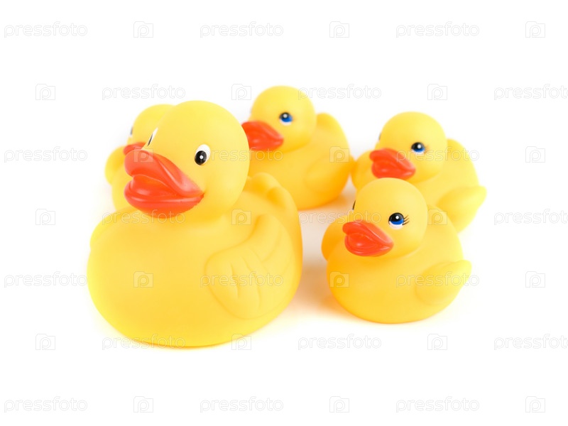 Игрушечные утка с утятами на белом фоне