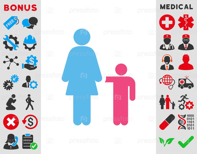 Мать с сыном иллюстрации значок. Стиль является биколор плоский символ, розовый и голубой цвета, закругленные углы, белый фон
