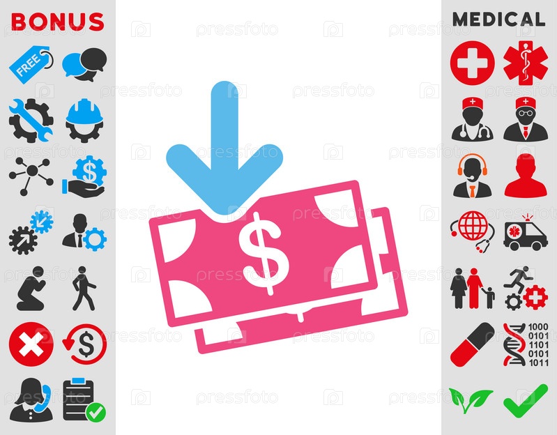 Деньги доход иллюстрации значок. Стиль является биколор плоский символ, розовый и голубой цвета, закругленные углы, белый фон
