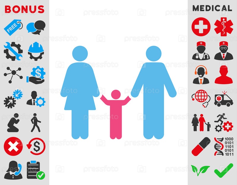 Родители и ребенок иллюстрации значок. Стиль является биколор плоский символ, розовый и голубой цвета, закругленные углы, белый фон