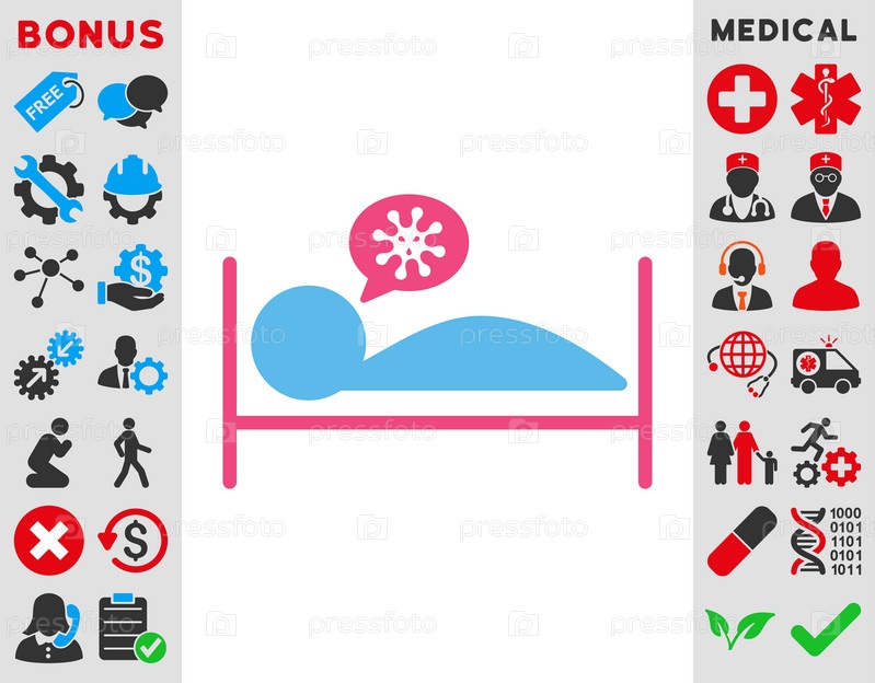 Пациент кровать иллюстрации значок. Стиль является биколор плоский символ, розовый и голубой цвета, закругленные углы, белый фон